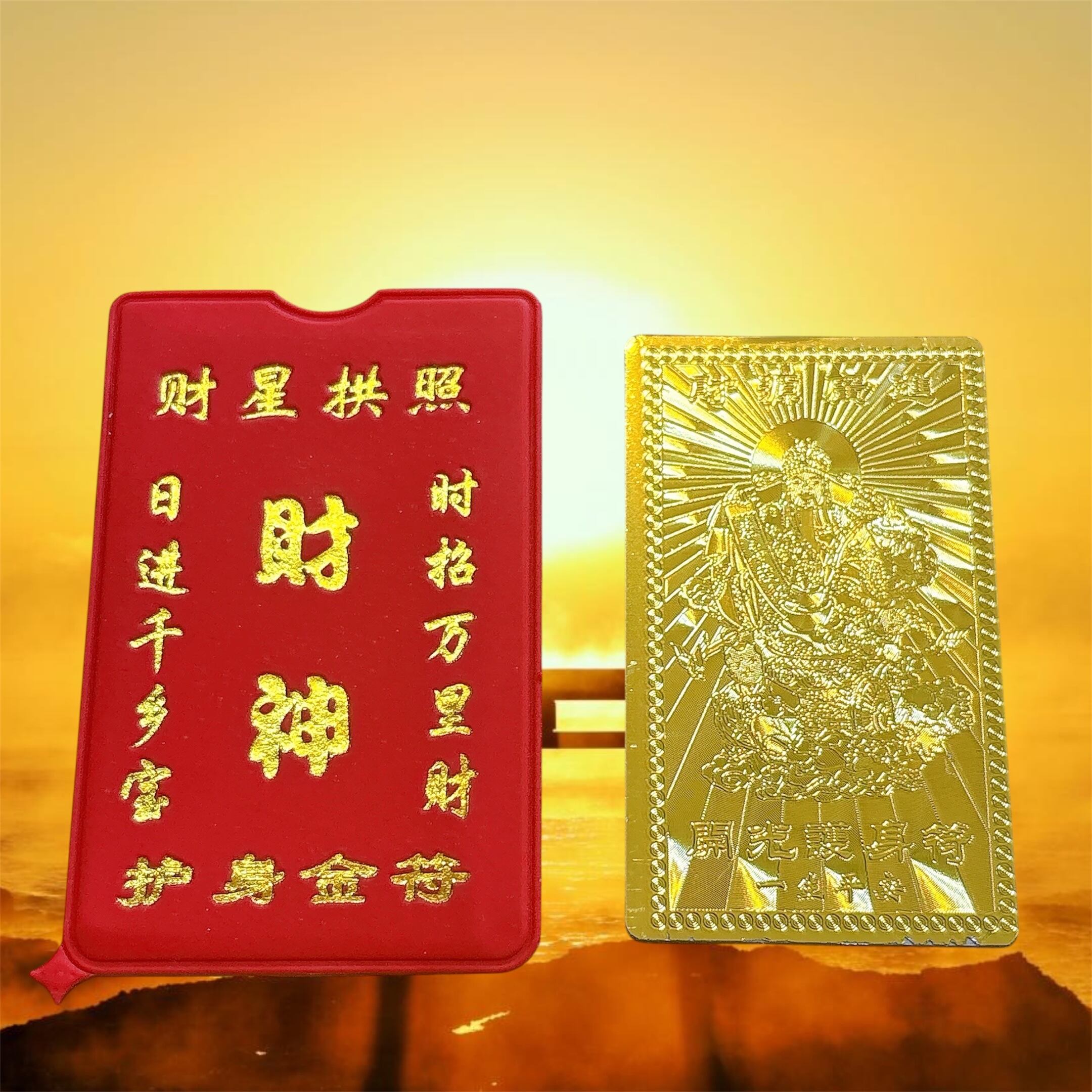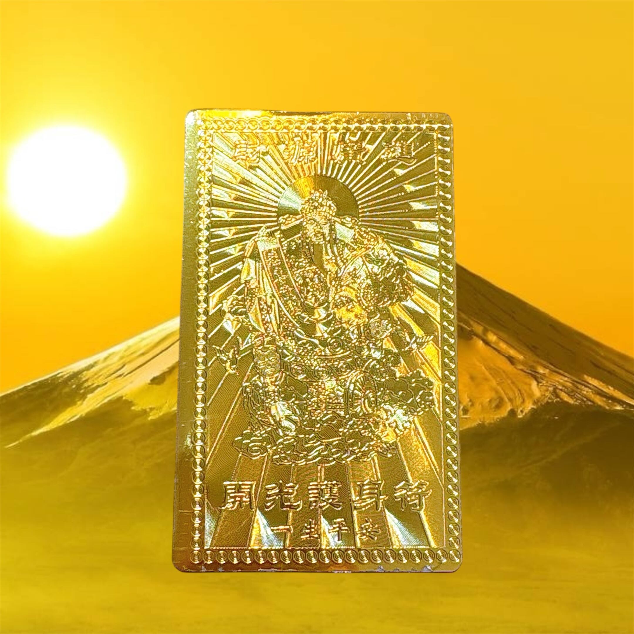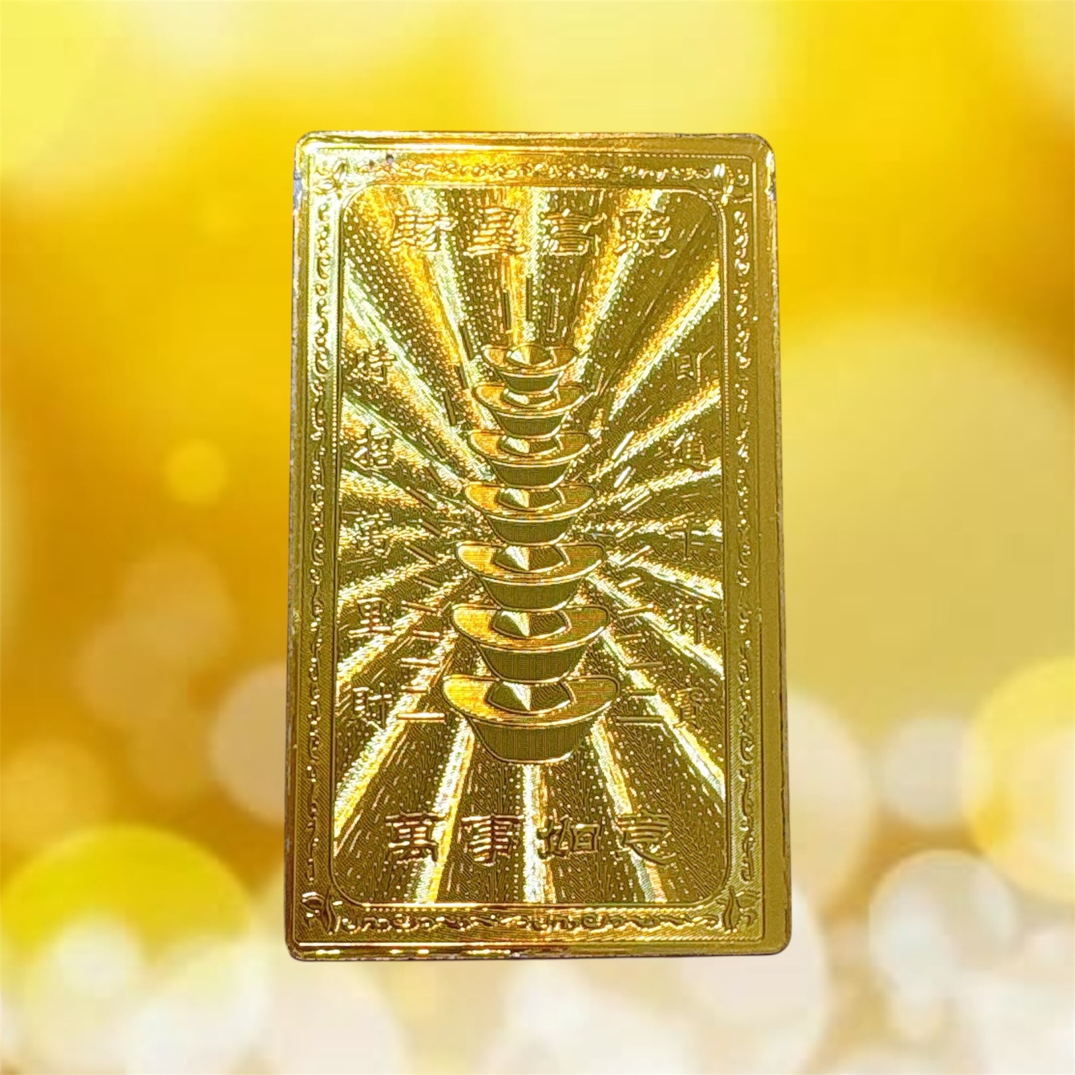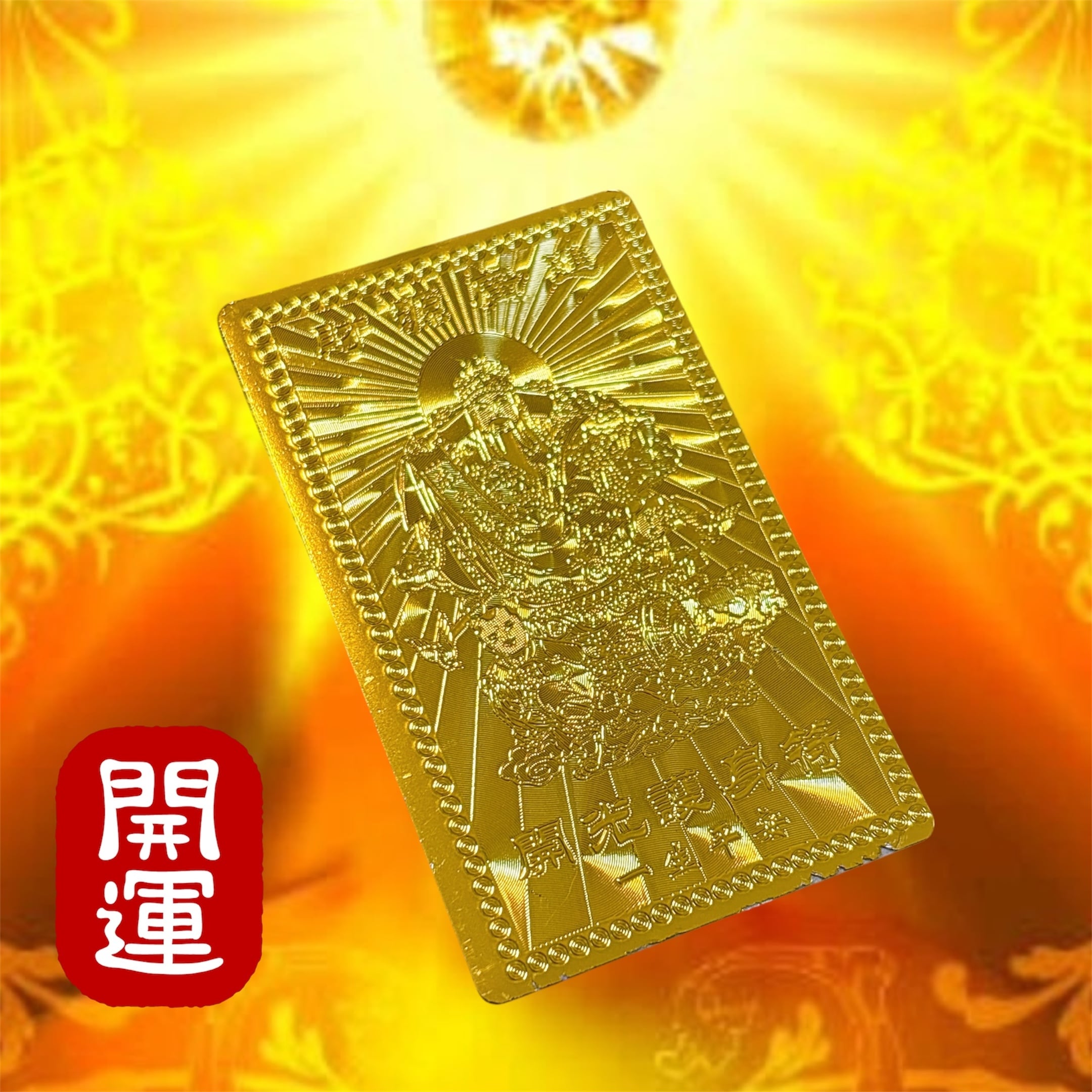 こちらの護符は、「金運がやってくる」「財産が集まる」「莫大な富を引き寄せる」という意味合いを持つ非常に縁起の良い金の護符カードです。